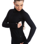 Black tech figure skating training jacket in Fetex fabric with cellphone side pocket and thumb slit Elite Xpression