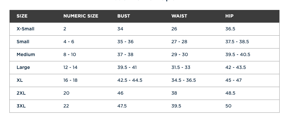 | Bust | 34 | 35-36 | 37-38 | 39.5-31 | 42.5-44.5 | 46 | 47.5 |