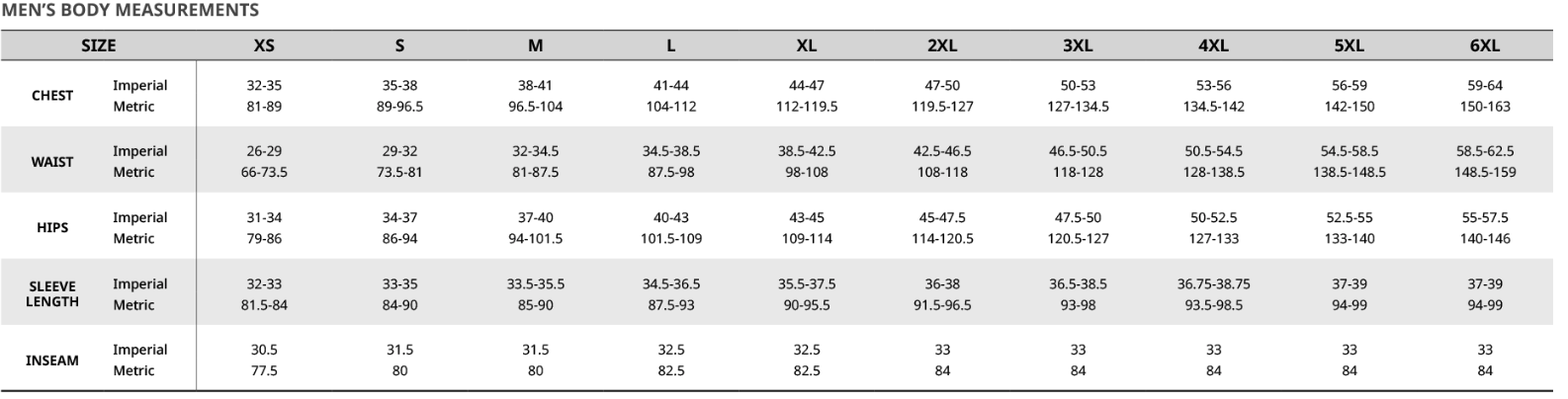 | Chest | 35-38 | 38-41 | 41-44 | 44-47 | 47-50 | 50-53 | 56-59 | 59-64 |
